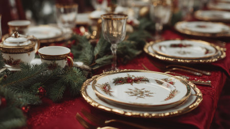 A stunning Christmas table setting featuring exquisite fine china and gold accents, adorned with greenery and a vibrant red tablecloth, perfect for holiday gatherings.