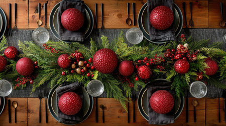 A beautifully arranged Christmas table showcases rich red ornaments, lush greenery, and elegant dining ware, creating a festive atmosphere for winter celebrations.