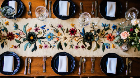handmade table dcor, a patchwork quilt table runner adds a touch of handmade elegance and warmth to a modern dining table, creating a cozy vibe in the room