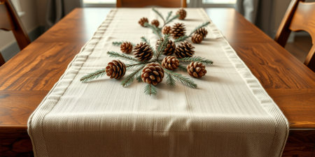 A charming rustic table setting featuring pine cones and greenery on a beige table runner, perfect for cozy family gatherings in autumn or winter.