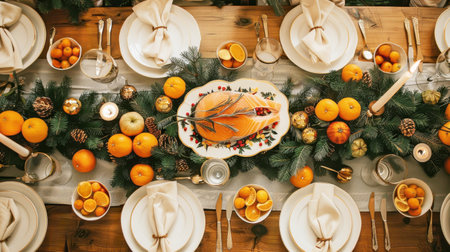 Top down view of a beautifully decorated holiday dining table. Features green plates, gold cutlery, fir branches, and tangerines creating a festive Christmas atmosphere.