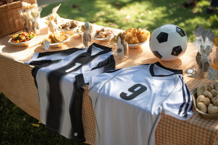 Friends gather for a vibrant soccer-themed picnic filled with jerseys, a soccer ball, and an array of tasty food under the open sky.
