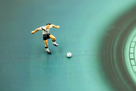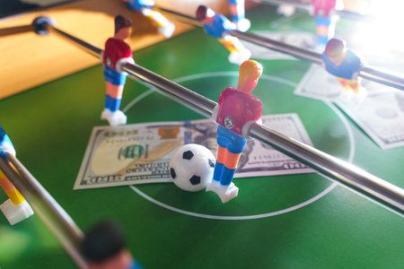 Table football game with US dollar bills scattered around it, alluding to a betting concept