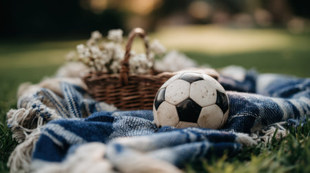 Soccer ball rests on cozy blue and white blanket, surrounded by woven basket filled with flowers. scene evokes sense of leisure and outdoor enjoyment
