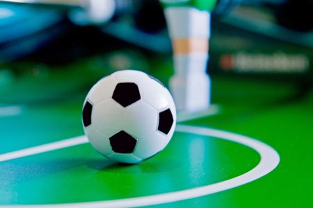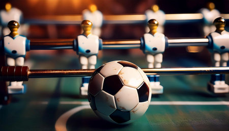 Foosball, closeup of a mini table football game with an old white and black soccer ball, selective focus. Generative Ai.
