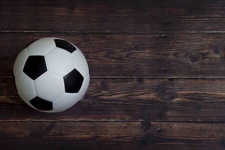 The soccer ball is placed on a wooden floor and has a blurred background with beautiful bokeh.