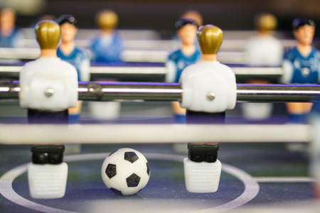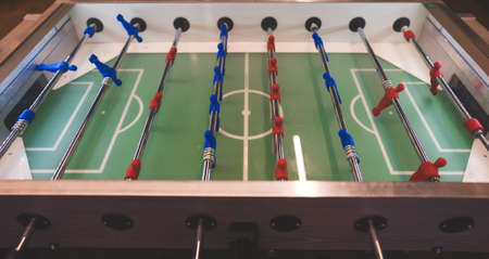 Close up of foosball Table Soccer Game match figures. Football Kicker Game with blue and red figurines.