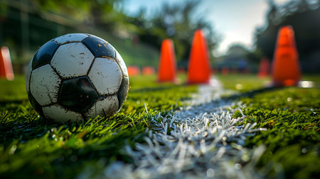 Soccer ball rests on the green grass of the field with the white boundary line in the foreground, embodying the spirit of the game