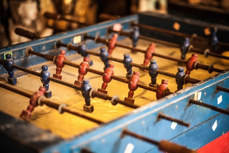 Close-up of players on a table football game (foosball), symbolizing competition, teamwork, and leisure activity.
