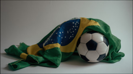 A soccer ball rests on a white surface, partially covered by a draped Brazilian flag.