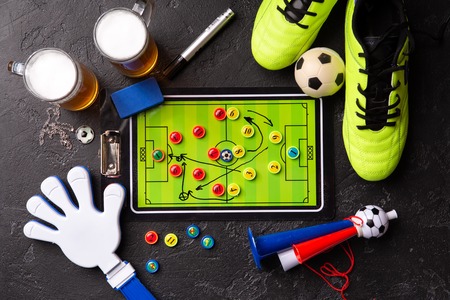 Photo on top of two mugs of foam beer, table football, ball, football boots, pipe, rattle toy