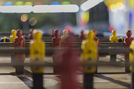 Close up on players of Table football soccer kicker foosball top-table game playing