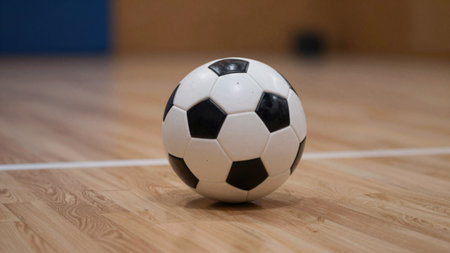 A black and white soccer ball sits on a smooth wooden floor, ready for play. The lighting creates shadows as players prepare for an exciting indoor training session.