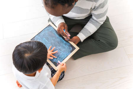 Child hand writing with chalk on empty chalkboard