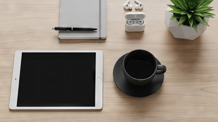An overhead shot showcases a workspace with a tablet, coffee cup, notebook, pen, and earbuds set on a wooden surface. The composition features neutral tones, with dark coffee contrasting against a light-colored desk and accessories. The image suggests a clean, uncluttered environment suitable for various commercial or editorial applications.