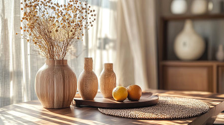 A serene still life with earthy vases, dried flowers, and citrus fruits bathed in soft sunlight. Perfect for creating a calming atmosphere at home. Generated A.I.
