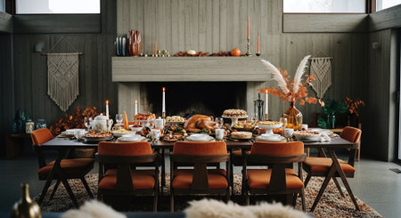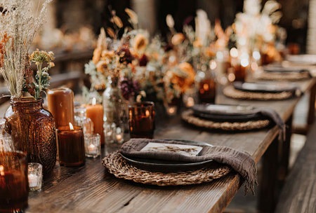 Elegant rustic dining table with autumn centerpiece and warm lighting. That the image is generated using AI.