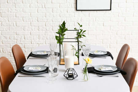 Modern interior design. Elegant table served in modern stylish dining room
