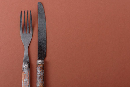 Knife and fork, cutlery on a brown background. Utensils for preparing dinner