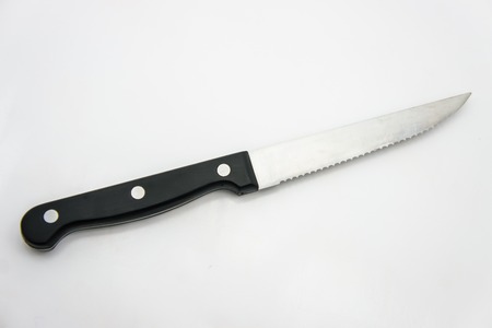 A sharp steak knife isolated on white marbler marbackground with red handle.