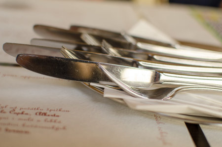 Knife and fork, cutlery on a brown dining table. Utensils and crockery for preparing dinner