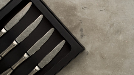 Kitchen knife and fork made of steel with copy space on a dark concrete background