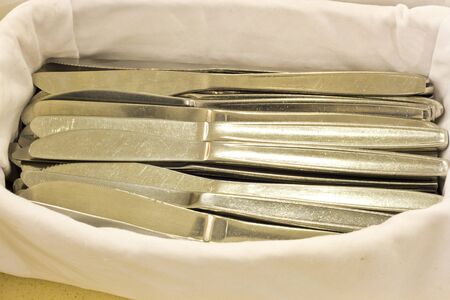 A butter knife photographed from above on a napkin, subtle shadows and clean lines