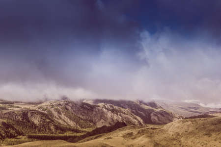 Beautiful view of the rocky ridge. Colorful mountains under the clouds.