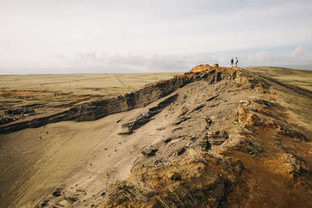 Cambara do Sul, Brazil - July 18, 2019. People on summit of cliff at Fortaleza Canyon with sunlight near Cambara do Sul. A small rural town with amazing natural tourist attractions. Retouched photo.