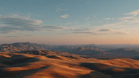 This image showcases a peaceful landscape featuring rolling hills draped in golden grass, under a clear blue sky. The tranquility of nature creates a calming scene, ideal for various projects.