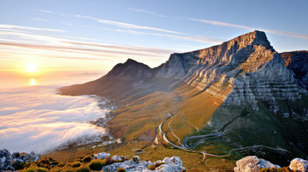 Generative AI : Aerial view of Lions Head mountain in low cloud Cape Town South Africa