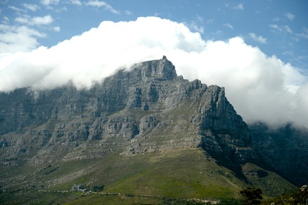 By a beautiful summer, a big cloud has formed on the Table Mountain in Cape Town, South Africa.