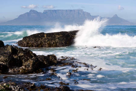 Table Mountain from Bloubergstrand with rocks in the foreground and water splash