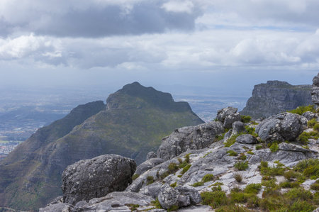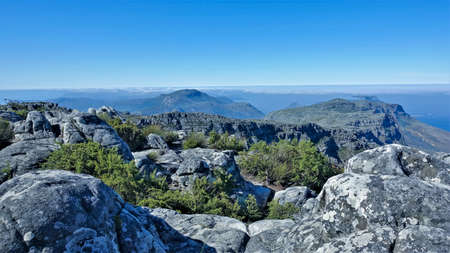 Alpine landscape. Ancient gray boulders lie on the flat summit of Table Mountain. Low shrubs, fynbos grow between the stones. In the distance, mountain peaks hide in the clouds. Cape Town.South Africa