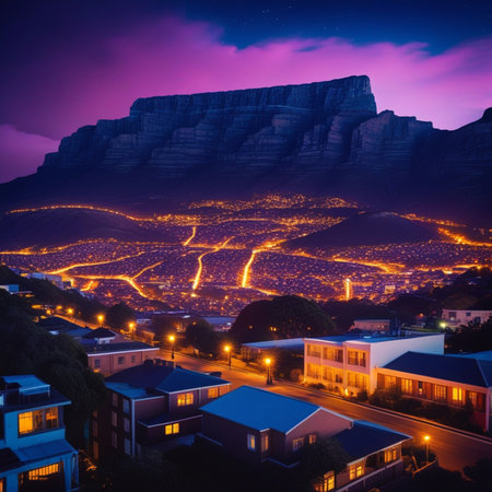 A breathtaking view from Lion's Head sunset hiking trail, featuring Table Mountain silhouetted against magical twilight hues, with the sparkling city lights of Cape Town below. AI-generated