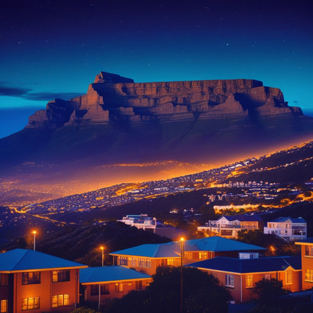 View of Table Mountain at night, Cape Town, South Africa.