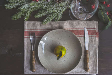 Simple Christmas table place setting on wooden background in vintage or rustic style. Festive table set for christmas or new year dinner.