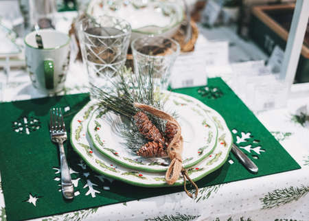 Christmas serving at home on the background of the Christmas tree. Waiting for guests.