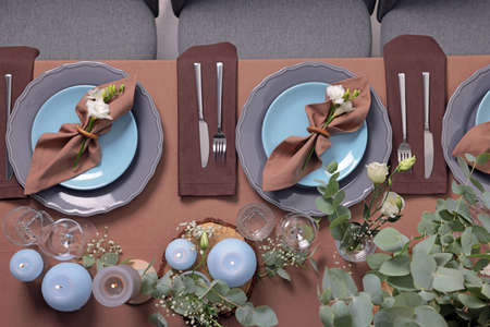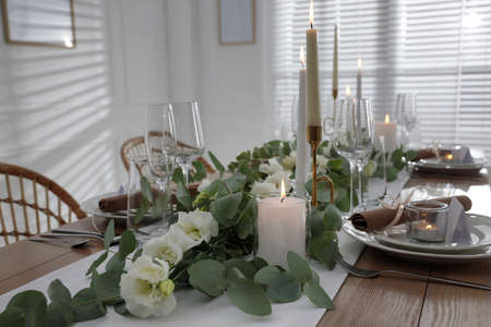 Luxury table settings for fine dining with candles and glassware, beautiful blurred background. For events, weddings. Preparation for holiday or romantic evening in loft interior.