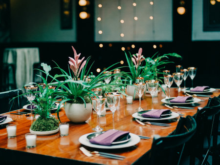 A lovely dining table with floral centerpieces, sparkling glassware, and soft lights creates an inviting vibe.