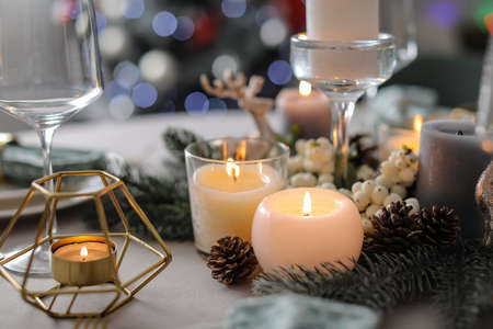 Dinner table setting by candlelight, Christmas Family Dinner Concept.