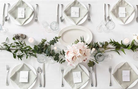 View of a formal dinner table with white tableware and flowers with no people