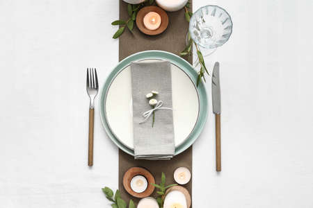 Beautiful table setting with burning candles on white background