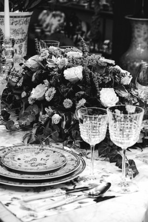 Glasses on the festive table setting. Wedding table decor concept. Table setting in classic style, setout. fine art.