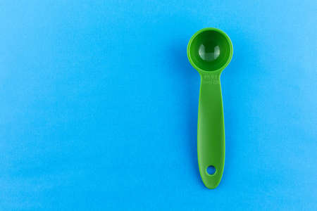 green measuring spoon of plastic on blue background.