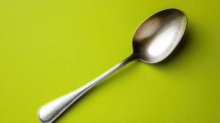 A simple silver spoon rests elegantly on a vibrant green surface, ideal for showcasing culinary artistry, table settings, or sleek kitchen aesthetics.