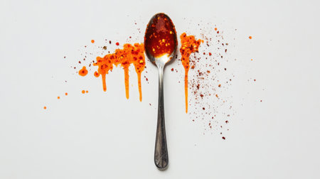 An artistic composition featuring a silver spoon filled with vibrant red chili sauce, surrounded by colorful spices, on a clean white background.