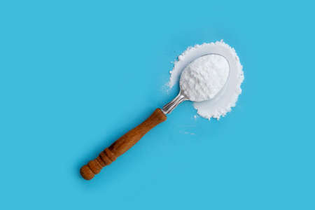 Baking soda on blue background.