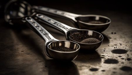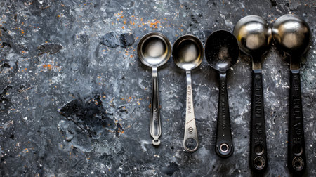 Various measuring spoons on textured dark surface