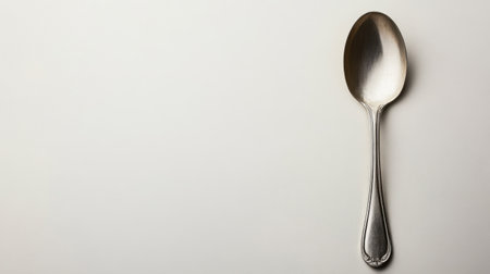 A sleek silver spoon rests on a smooth beige surface, creating an elegant and minimalistic aesthetic. Ideal for culinary visuals or kitchen decor themes.